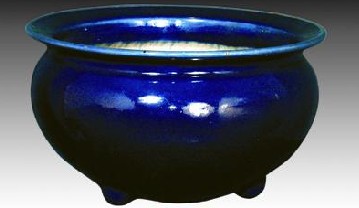 圖1、康熙景德鎮(zhèn)祭藍(lán)釉乳足爐:器型為唇口外侈,束頸,鼓圓腹,下承半圓狀三乳足,口徑25.3厘米,高14.6厘米,足距9.3厘米,爐內(nèi)施白釉,爐外施高溫鈷藍(lán)釉,釉面晶瑩剔透,像藍(lán)寶石一般,濃艷可人。仔細(xì)觀察,在釉面下聚集小氣泡遍布通體;底足露胎處,胎釉結(jié)合緊密,胎質(zhì)純凈細(xì)膩,如同糯米粉一般細(xì)白,但又不失堅(jiān)致細(xì)密,胎體顯得較為厚重,整體造型古拙,凝重而質(zhì)樸,此爐經(jīng)過三百年時(shí)間,釉色乃保持著明亮清澈而不失深沉含蓄,器型完整無缺,實(shí)為一件不可多得的康熙民間佳器。