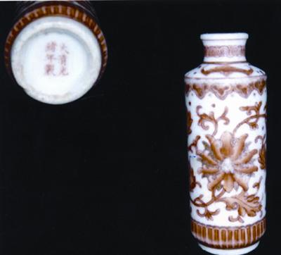 朋友鐘兄喜好收藏,在北京地區(qū)小有名氣,與我是舊交。前幾日,鐘兄打電話過來說得了一件清代光緒的鼻煙壺,要筆者幫他掌眼鑒定真?zhèn)。于是鐘兄趁出差之際特意將此物帶到我處。打開小錦盒,一件制作精致的清代光緒官窯礬紅金彩纏枝蓮小瓶(見圖)立刻躍入眼簾。瓶高8.5cm,上面細描蝙蝠、如意和纏枝蓮紋,寓意福壽吉祥,描金彩;底款楷書“大清光緒年制”,款字書寫筆畫規(guī)范有力。整只小瓶制作精細,比例對稱,上面的圖案線條規(guī)矩流暢,同時金彩又為本金。根據(jù)自己多年研究古陶瓷經(jīng)驗,此瓶應為光緒年間官窯真品,可能是當時御藥房裝藥材器物,而非鼻煙壺。