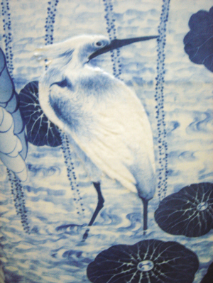 瓶頸和腹體裝飾都是分三個(gè)主要層次:上層是復(fù)式如意云首,每一云首內(nèi)繪一朵蓮花,為明洪武、清康熙云首風(fēng)格,瓶頸、腹體如一;中層為主畫面,瓶頸簡(jiǎn)約地繪畫一周連枝葡萄,瓶腹體繪荷塘景物通景一周,為整個(gè)瓶體裝飾的主畫面;下層為復(fù)式變形蕉葉紋飾,每一蕉葉尖飾一云頭,云頭內(nèi)繪一朵蓮花。腹體主畫面所繪蓮荷的蓬、花、苞、葉含放舒卷自如,蓮荷之間繪有四只款款飛舞的蜻蜓,三只立于荷梗之上的精靈黃鶯,三只偃仰反側(cè)的鷺鷥,三只姿態(tài)各異(蹲、跳、浮游)的青蛙。整個(gè)荷塘極具縱深感、立體感,景物工寫兼?zhèn),瀟灑飄逸,栩栩如生,一派生機(jī)勃勃的景象。瓶頸的上、下口沿另外繪有云氣紋和回紋一周,使瓶頸愈發(fā)顯得富麗堂皇;腹體脛下另有一組波紋曲線和一圈連枝紋環(huán)繞。整個(gè)瓶體畫面莊嚴(yán)大方,氣象清新。