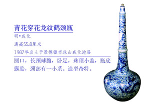 1987年于江西省景德鎮(zhèn)珠山明御廠故址出土:圓口,長頸,球形腹,臥足。珠頂鐘形蓋,內(nèi)有一較長的管狀物,與頸緊密接合。頸部有一小系。腹繪穿花龍二條,下繪侮水。長頸中央有一凸起弦紋分上下兩節(jié):上節(jié)繪云紋,下節(jié)飾龍紋。此瓶繪五爪龍,當屬帝王用器。