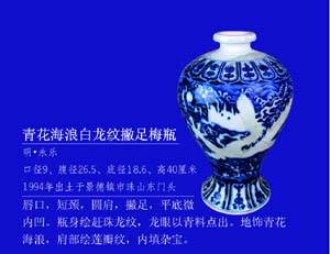1994年出土于珠山:唇口、短頸、圓肩、撇足。平底微內(nèi)凹,瓶身刻戲珠五爪龍,地飾青花海浪,龍眼以青料點(diǎn)出,肩部繪蓮瓣紋內(nèi)填雜寶,撇足繪蓮瓣紋,內(nèi)填蓮花。該梅瓶青料濃艷,多有黑褐色斑塊。