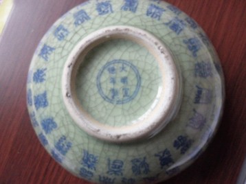宣德官窯器載款的器底釉面,白中閃青,晶瑩滋潤并有橘皮紋。宣德官窯款,一般用進口的蘇麻離青料,或在進口料中適當(dāng)摻入一些國產(chǎn)青料寫就。呈色多為濃重的純藍,深邃處有鐵的結(jié)晶斑。但款銘色澤濃度不一,并痛覆蓋款銘的透明白釉緊密結(jié)合,使得筆畫的四周好像上了一層白霧。用八倍以上的放大鏡在強光下審視,款色多霧暗而下沉,器身和口內(nèi)、足內(nèi)釉薄處,閃有明顯的牙黃色;濃釉處微閃淡青色。