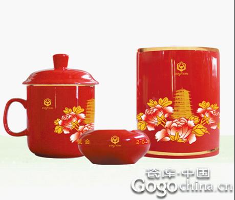 圖:中國紅瓷長安開花陶瓷茶杯辦公3件套