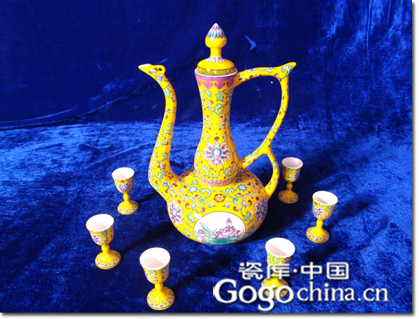 圖:帝黃琺瑯彩卷草紋寶蓮花龍鳳酒具
