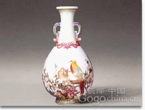 圖:高檔瓷器極品琺瑯彩花石錦雞圖雙耳瓶--可定制