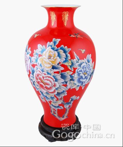 圖:富貴牡丹花開(kāi)紅瓷侍女花瓶