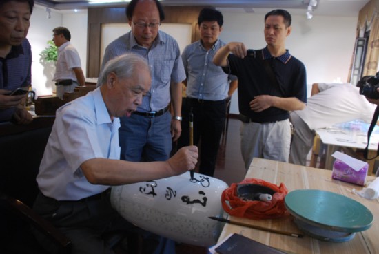 雖說年輕,但筆者和邵老也算是忘年交。一來二往,相識已有五六載,最近一次見面是在景德鎮(zhèn)的一次筆會上。一個耄耋之年的老人風(fēng)塵仆仆從北京來到景德鎮(zhèn),自然不是旅游這么簡單。他雖說不是第一次來景,但和上一回也已相隔12年有余。若不是為家鄉(xiāng)淳安千島湖藝術(shù)館的開館進行陶瓷書法創(chuàng)作,邵老恐怕至今也無緣見到自己為景德鎮(zhèn)雕塑瓷廠大門題寫的“藝術(shù)瑰寶”四字。