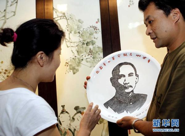 9月13日,陶瓷藝術(shù)家李德惠(右)在向參觀者介紹高溫白釉瓷盤(pán)《孫中山肖像畫(huà)盤(pán)》。當(dāng)日,亞洲最大規(guī)模的藝術(shù)品交易盛會(huì)“2011上海藝博會(huì)”在上海世貿(mào)商城向?qū)I(yè)人士開(kāi)放。來(lái)自12個(gè)國(guó)家的155家畫(huà)廊攜數(shù)千件油畫(huà)、中國(guó)畫(huà)、陶瓷、版畫(huà)、雕塑、水彩、攝影、裝置等藝術(shù)品參展。據(jù)悉,“2011上海藝博會(huì)”將于9月14日至18日在上海世貿(mào)商城舉辦。