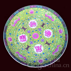 乾隆朝除了白地繪粉彩外,還有色地粉彩或色地開光中繪粉彩等品種。乾隆朝粉彩的創(chuàng)新品種是在黃、綠、紅、粉、藍(lán)等色地上用極細(xì)的工具軋出纏枝忍冬或纏枝蔓草等延綿不斷的紋飾,且多和開光一起使用,人稱軋道開光。這一工藝的出現(xiàn),將粉彩推上了更加富麗繁縟的頂峰,一直延續(xù)到民國(guó)。另外,乾隆朝還有部分在粉彩瓷器的內(nèi)壁及底足內(nèi)施綠彩,俗稱"綠里綠底",一直流行到清末、民國(guó)。乾隆朝的"綠里綠底"極淺淡,迎光側(cè)看釉面有極細(xì)小的皺紋,像微風(fēng)吹過平靜的湖面而形成的細(xì)波。綠彩附著在白釉上非常緊密,幾乎沒有爆釉現(xiàn)象。
