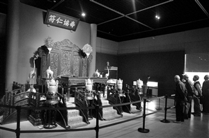 昨天,在眾多展品中最引人注目的就是乾隆帝的金鑾殿。由黑漆描金山水紋寶座、紫檀有束腰腳踏、紫檀嵌琺瑯面西洋卷草紋束腰外翻馬蹄腿長桌、琺瑯人物戲象擺件、琺瑯鶴燈和琺瑯香爐等寶物組成的“金鑾殿”可謂是原汁原味,只比頤和園的勤政殿稍微小一點。這間“皇帝的辦公室”大有玄機,秦雷告訴記者,“琺瑯鶴燈除了有作為燭臺的作用外,還有"天降吉祥"的寓意,m瑯人物戲象也有"太平景象"的寓意。”而臺階之間擺放的琺瑯香爐也有玄妙,“點香不僅可以凈化空氣,而且在皇帝接見大臣時,香煙繚繞,既可以營造神秘的氣氛還能讓皇帝顯得特別威嚴(yán)。”