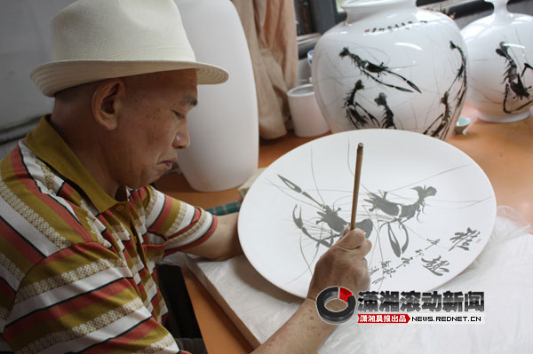 (9月19日,醴陵元詔瓷業(yè)公司,中國書畫家鐘喬清在瓷胚上現場畫蝦。