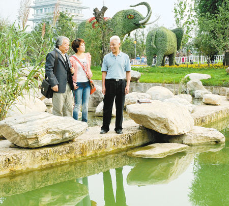 圖為面對(duì)世園美景,楊火。ㄓ乙唬⿲(duì)陪同游覽的西安朋友說(shuō):“看到這片水面,讓我想起了自己家鄉(xiāng)的鄱陽(yáng)湖。”