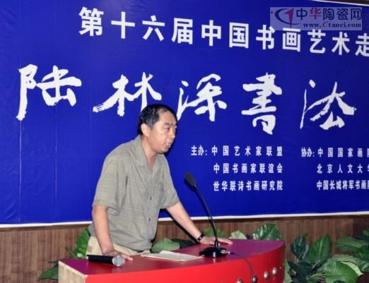 著名鈞瓷鑒賞家、收藏家張國(guó)鵬先生向本次大會(huì)獻(xiàn)上鈞瓷作品,并發(fā)表了熱情洋溢的講話(huà)。他說(shuō),中國(guó)書(shū)畫(huà)藝術(shù)走向何方高峰論壇作為文化長(zhǎng)征的重要載體,已經(jīng)在大江南北成功舉辦了十五屆,建立了一座座豐碑,是一項(xiàng)利國(guó)利民的偉大壯舉。為廣大藝術(shù)愛(ài)好者和藝術(shù)收藏者搭建了一個(gè)廣闊的展示平臺(tái)和對(duì)接平臺(tái)。讓更多的人們了解文化藝術(shù)、尊重文化藝術(shù)。文化長(zhǎng)征的發(fā)展和成長(zhǎng)有利于提高廣大人民群眾的文化素質(zhì)和文化修養(yǎng),是源遠(yuǎn)流長(zhǎng)的中華文明得以傳承和發(fā)展。這一壯舉對(duì)于構(gòu)建和諧的社會(huì)主義大家庭有著更加深遠(yuǎn)的影響。“家中無(wú)瓷畫(huà),必是俗人家”,陶瓷藝術(shù)和書(shū)畫(huà)藝術(shù)可以說(shuō)是文明的象征、文化的代表、修養(yǎng)的標(biāo)識(shí)。品味和收藏藝術(shù)作品能夠讓人增長(zhǎng)知識(shí),陶冶情操,更能讓人脫俗向上,品格生輝。潘家園是享譽(yù)京城乃至世界的文化寶地,有著濃厚的文化氛圍。陸林深先生是享譽(yù)江南和全國(guó)優(yōu)秀書(shū)法家,其作品被許多單位,個(gè)人和國(guó)家首腦收藏。作為一名鈞瓷藝術(shù)和書(shū)畫(huà)愛(ài)好者,能參加本次活動(dòng),我深感榮幸。