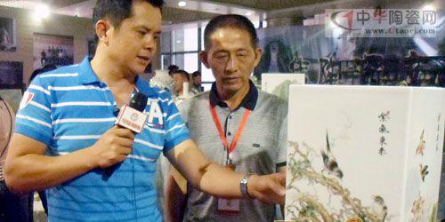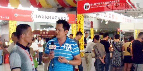 景德鎮(zhèn)陶藝大師席新明在民博會上向電視媒體介紹景德鎮(zhèn)陶瓷文化