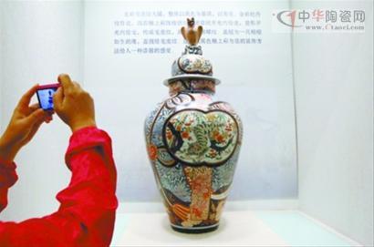 此次展出的五彩龍虎紋大罐高91厘米,直徑41.6厘米,是器形較大的一件展品,整體以黑色為基調(diào),蓋鈕上的一只鷹栩栩如生,蓋腹繪有龍虎紋圖案。 記者 查金輝 攝