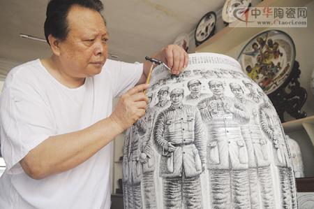 此瓶為白瓷,高80厘米、最大直徑63厘米、瓶口42厘米,利用刻瓷獨(dú)有的手法,展現(xiàn)了87名中國(guó)共產(chǎn)黨成立以來(lái)的歷史人物,選材廣泛,題材重大,雕刻達(dá)到1700多萬(wàn)刀,在全國(guó)陶瓷界實(shí)屬罕見(jiàn),具有極高的收藏價(jià)值和藝術(shù)價(jià)值。圖為閆先公正在對(duì)大型刻瓷瓶《領(lǐng)袖與將帥》進(jìn)行最后的修正。