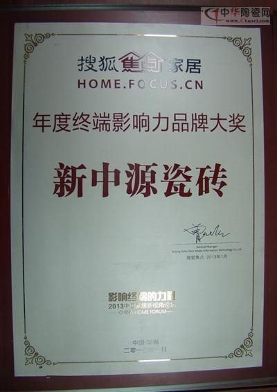 2013年1月17日,“影響終端的力量”2013家居新視角論壇在深圳京基100大廈瑞吉酒店隆重舉行。來自眾多機構(gòu)協(xié)會和知名企業(yè)的領導、領袖企業(yè)家及行業(yè)精英等共300余名行業(yè)嘉賓蒞臨現(xiàn)場,圍繞以終端用戶為中心的話題,全面探討了家居行業(yè)的現(xiàn)狀與發(fā)展,探尋影響終端的力量。同時主辦方聯(lián)合中國建筑裝飾協(xié)會、中國建筑衛(wèi)生陶瓷協(xié)會及中國家具協(xié)會等支持機構(gòu)共同對2012年度終端表現(xiàn)突出的家居品牌進行表彰和鼓勵,新中源陶瓷憑借卓越的行業(yè)美譽度和強大的終端品牌影響力,榮獲“年度終端影響力品牌”。