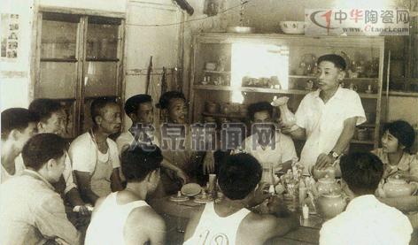 銷路問(wèn)題解決了,隨著新廠成立而來(lái)的難題也被一個(gè)個(gè)攻克了。賴自強(qiáng)帶領(lǐng)技術(shù)骨干進(jìn)行青瓷胎釉、造型和生產(chǎn)工藝試驗(yàn)。廠里的工人們經(jīng)常圍著賴自強(qiáng)討教青瓷方面的問(wèn)題,照片正是拍于那個(gè)時(shí)候。