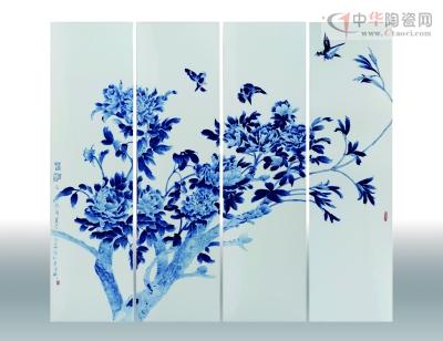 《春酣》選用瓷板四條屏,采用青花分水技法。