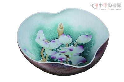 陶藝作品《蓮升》,利用手工拉坯之后有意識(shí)設(shè)計(jì)變形出異型碗口,打破常規(guī)視角,外部施以高溫窯變顏色釉,碗內(nèi)雕刻出荷花。