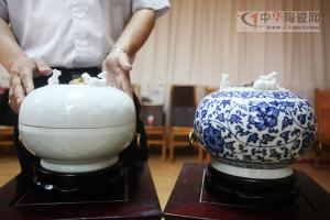 吳館長介紹說:“茶葉罐共有兩款,一款屬于青瓷,一款屬于青花瓷。它是用瓷石和高嶺土等優(yōu)質(zhì)原料,經(jīng)過1200℃-1400℃的高溫燒制而成,每件制作工藝復雜,不是簡單的復制古文物,還具有現(xiàn)代的審美觀及實用性,只能限量發(fā)售。而三羊開泰茶葉罐不僅具有極高的觀賞價值,它還是一個儲藏茶葉的容器。