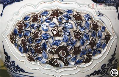 相對(duì)于青花而言,元代青花釉里紅的制作更少,存世就更為罕見。特別是這件蓋罐還采用模印貼花的復(fù)雜工藝,造型厚重典雅,氣勢(shì)宏大;裝飾技法多樣,紋樣繁縟精美,色彩藍(lán)艷含蓄,彩裝飾和胎裝飾技法得到完美的結(jié)合,青花和釉里紅集于一器,白地藍(lán)花與藍(lán)地白花相映成趣;罐腹部開光紋飾采用貼花技法,使器物的平面裝飾又增添了幾分鏤雕藝術(shù)的立體效果,這種集多種裝飾手法于一器的工藝特征,在珍貴的元代青花瓷中也極為少見,當(dāng)為國之瑰寶。
