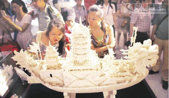 湖北展廳里,讓觀眾最感到神奇的莫過于仙桃的貝雕。這種手工藝的原材料是淡水貝殼,主要產(chǎn)自仙桃的沙湖。一件長近1米的龍船通體雪白,好像會發(fā)光,表面由很多的小方格粘結(jié)而成,但船面平整、做工細(xì)膩,傳承人徐銀枝說,“這一臺做起來要用半年,需要先把弧形的貝殼磨平,磨成各種形狀,再往一起拼接”,最難的部分就是比較細(xì)小部分的雕刻,力道的掌握要很準(zhǔn),只見龍船上房屋的鏤空花樣板由數(shù)不清的小格子組成,格子小的連大點(diǎn)的螞蟻都過不了。