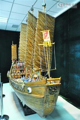 在民間藝術(shù)新作展上,根據(jù)史料復(fù)原的“鄭和寶船下西洋場景”尤為吸引眼球。該寶船根據(jù)香港海事局提供的《天妃經(jīng)》圖卷按照10:1比例進(jìn)行創(chuàng)作,長約3米,高約3米,歷時四個半月才完成,并依據(jù)明代祝允明《前聞記下西洋》的記載,設(shè)有旗軍、火炮手、舵工、醫(yī)士、太監(jiān)、民艄等,同時內(nèi)部還配有航海時的音響,結(jié)構(gòu)精巧復(fù)雜,場景惟妙惟肖,引來現(xiàn)場觀眾陣陣贊嘆聲。另一件藝術(shù)新作“童趣”核雕個頭雖然“迷你”,但卻在方寸間活靈活現(xiàn)地展現(xiàn)出三個小朋友放風(fēng)箏的生動場景,人物刻畫栩栩如生,尤其是風(fēng)箏線更是細(xì)如發(fā)絲,令人拍案叫絕。剛剛獲得中國人口文化獎的蘇繡《椅中圣母》昨天也亮相現(xiàn)場,讓市民領(lǐng)略了蘇繡的藝術(shù)魅力。