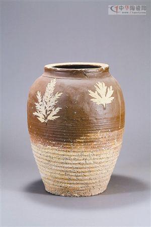 明代大同地區(qū)窯場(chǎng) 黑褐釉貼草葉紋缸