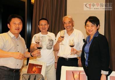 鷹牌陶瓷副總裁陳賢偉(左一)、建材周刊董事長羅青(左二)、佛山市陶瓷行業(yè)協(xié)會副會長黃希然(左三、)與陶瓷總部副總經(jīng)理湯潔明(左四)共同舉杯祝酒