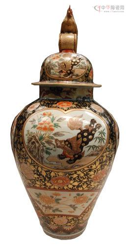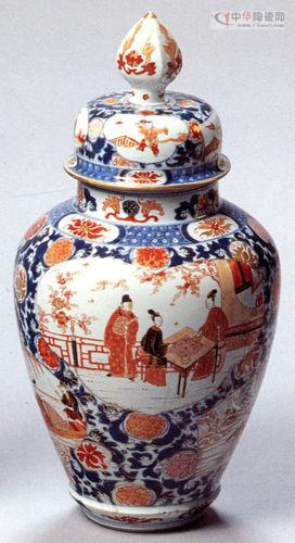 進(jìn)入1690年以后,日本瓷器逐漸形成了以“金襕手”風(fēng)格為代表的“古伊萬里”風(fēng)格,日本古代瓷器也發(fā)展到了高峰階段。“金襕手”風(fēng)格瓷器的特征是釉下青花與釉上彩結(jié)合裝飾,再施繪金彩,以大蓋罐等器形為主(圖3、4)。由于大量使用紅彩和金彩,故顏色鮮艷,整體風(fēng)格顯得絢爛奪目、雍容華貴,這與當(dāng)時歐洲流行的洛可可風(fēng)格的趣味是一致的。