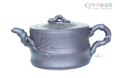 他的紫大竹提梁壺,泥色近如成竹,壺身飽滿挺拔,以竹節(jié)制成壺嘴,並綴一小竹枝於壺體,疏密有致﹔竹葉如風(fēng)吹拂,以曲折的帶葉的小竹根作為壺蓋的紐,以細(xì)竹枝彎成方中見(jiàn)圓的提梁,竹節(jié)的紋理、竹芽的點(diǎn)綴都顯示出細(xì)膩逼真的效果。另一件代表作提梁弧棱壺,更顯示了吳雲(yún)根對(duì)方圓之道的領(lǐng)悟。壺的主體為弧棱,壺把改為平式提梁,方中有圓、圓方互濟(jì)、相得益彰。既體現(xiàn)了虛與實(shí)、圓與方的對(duì)比效果,又彰顯了中國(guó)古代儒道學(xué)說(shuō)的精神。