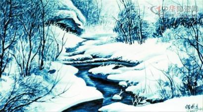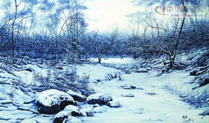 《薄霧余光》,那是一幅冬天的森林景色,白雪皚皚,鋪滿大地,也掛滿了枝頭。樹葉凋零了,枝干仍然挺拔,大雪壓不倒,傲立風(fēng)雪中,那種滄桑感躍然“紙上”。作者力圖用冷艷來詮釋意境,因此,在色彩上,用白色的雪和青色的枝干交相輝映,斑斑駁駁,或?qū)哟畏置,或朦朦朧朧,《薄霧余光》,引人入勝。
