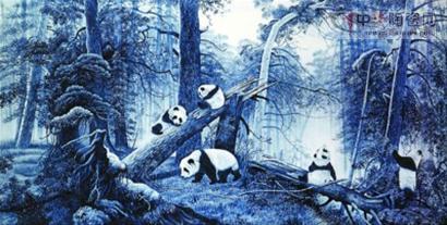 《歡樂家園》是一幅大尺寸的瓷板畫,畫面上是一片森林。巨木參天,五只可愛的熊貓寶寶神態(tài)各異,有的在打盹,有的在攀爬,有的在玩耍,有的在行走,快樂悠閑,這是一種作者的心境描寫,展示對(duì)生活的熱愛與追求。青花追求的是一種簡(jiǎn)潔明快,而作者在整個(gè)畫面上滿滿當(dāng)當(dāng),很少留白,這就顯示了他的功力。在這幅畫面中,無論布局與構(gòu)圖,作者都能用豐富的層次來展現(xiàn)。同樣參天大樹,遠(yuǎn)處是淡淡的,近處不惜濃墨;憨態(tài)可掬的熊貓,無論是動(dòng)還是靜,生動(dòng)活潑;特別在畫面的中央,透出幾縷陽光,讓人有種豁然開朗的感覺,不會(huì)因色彩的單一和畫面的紛繁而感到沉悶。