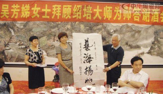 近日,在宜興丁山國際大酒店舉行中國工藝美術大師顧紹培先生收徒儀式及吳芳娣拜師答謝酒會,儀式由宜興日報副總編岳鵬主持,應邀參加酒會的有宜興市陶瓷行業(yè)協(xié)會會長史俊棠、江蘇省宜興紫砂工藝廠廠長徐建榮、宜興市方圓紫砂有限公司董事長王俊華、資深紫砂撰稿人蔣堯基、崔聽槐、時順華、顧紹培大師家人及門徒(江蘇省工藝美術大師華健夫婦、江蘇省工藝美術名人莊玉林、江蘇省工藝美術大師許艷春等)和社會各界人士近100多人。