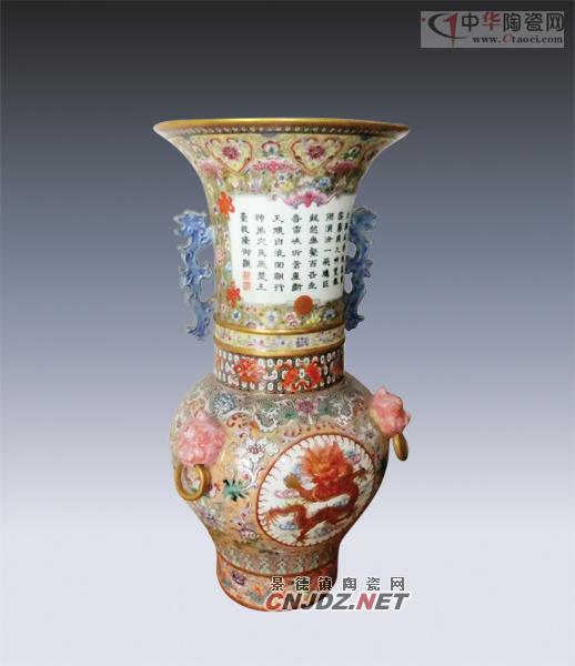 余勁松認(rèn)為:好的作品就是孤品、絕品,是不能復(fù)制的永久的經(jīng)典。此件《九五之尊》作品是150件吉祥圖案冬瓜瓶,它上面頸口用龜景重工結(jié)果裝飾,瓶頸有“福祿壽”三多圖案,寓意多子、多福、多壽。里面用傳統(tǒng)“萬(wàn)字頸”鑲嵌而成。瓶肩采用五鳳穿萬(wàn)花,由赤金描繪而成。瓶的主題就是“九龍”,九龍穿花,由西蕃洋蓮穿插,顯示出富麗堂皇、氣宇軒然的皇家氣派。底色之上由鳳尾草鑲嵌而成,也就是在顏色上面再次結(jié)果,這種重彩裝飾燒成風(fēng)險(xiǎn)很大,但最終這件作品還是以其完美無(wú)瑕展現(xiàn)在世人面前。這是余勁松一輩子的心血之作,這件作品對(duì)他來(lái)說(shuō)已經(jīng)不可復(fù)制。毫不夸張地說(shuō),這件作品從傳統(tǒng)文化著手,以中國(guó)傳統(tǒng)龍鳳圖案為設(shè)計(jì)亮點(diǎn),運(yùn)用現(xiàn)代陶瓷各種工藝表現(xiàn)手法,民族特色和原創(chuàng)成為這件作品真正的生命力和原動(dòng)力,在傳統(tǒng)古典陶瓷藝術(shù)史上也屬于一件傳世之作、稀世珍品。