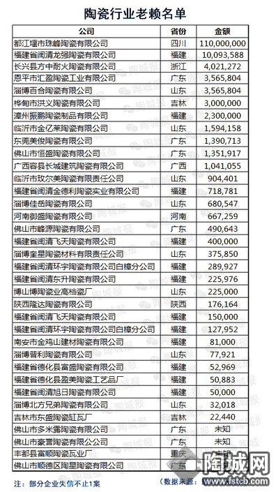 據最高人民法院公布的全國法院失信被執(zhí)行人名單及人民網的統(tǒng)計顯示,有33家陶瓷企業(yè)被列入老賴黑名單,以福建省最多。其中最大的老賴是四川都江堰市珠峰陶瓷有限公司,最高失信金額1.1億。
