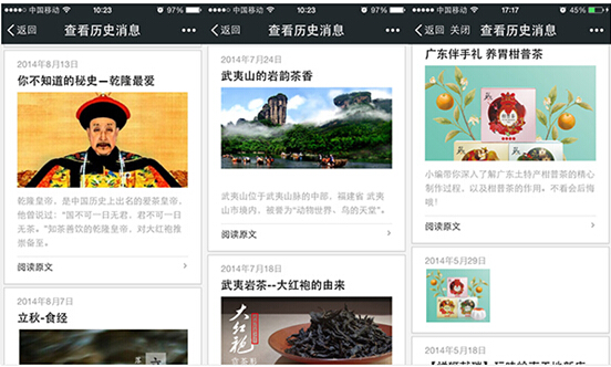 由廣州玩味工藝品有限公司運營的公眾號“玩味禮品”是一家集設計、開發(fā)、銷售、服務于一體的公司。目前產(chǎn)品以紙制品為主,包括各類筆記本、創(chuàng)意文化用品以及商務禮儀禮品等。該微信從乾隆的喝茶秘史到儒、道、佛家語茶文化的淵源介紹,用“文化”做切入點,輔以節(jié)假日相關活動及茶禮,有效推動了微信目標用戶的關注。