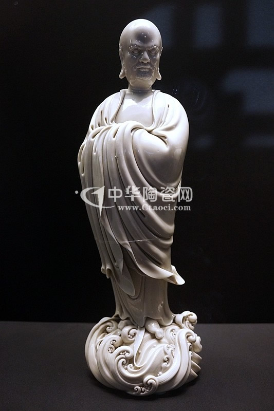 這件立像與其他德化窯瓷塑人物一樣,體量不大。但卻將波濤之上一葦渡江的達摩表現(xiàn)得維妙維肖。與同室展出的那些工藝繁復(fù)、技巧高超的當代佳作相比,何朝宗所作此像,在精準優(yōu)美的人物形象塑造和令人叫絕的衣紋水波再現(xiàn)之外,可能還是在精神面貌的刻畫上更勝一籌。正所謂——妙不可言。