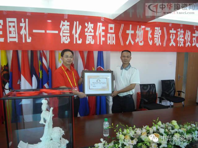 《大地飛歌》成為“2008年中國(guó)—東盟博覽會(huì)指定國(guó)禮”,贈(zèng)送給東盟各國(guó)國(guó)家領(lǐng)導(dǎo)人,并載入東盟史冊(cè);2010年泉州霞洲媽祖宮赴臺(tái)灣臺(tái)南大天后宮祭奠之時(shí),德化瓷塑作品《大地飛歌》被作為禮品贈(zèng)送給國(guó)民黨主席馬英九。