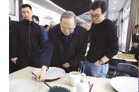 曾培炎等人先前往三樓臺華窯的陶瓷研習中心,藝術(shù)家孔依平、顏聖哲、鄭善禧等人平常創(chuàng)作之地,除了參觀了藝術(shù)家的創(chuàng)作,曾培炎還用青花色繪料在白坯瓷盤上題字留念。接著再參觀了典藏藝廊、彩繪教室等地,約一個小時離去。