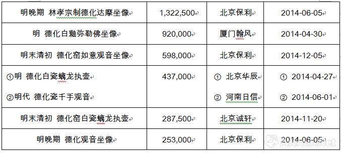 結(jié)語(yǔ):中國(guó)陶瓷藝術(shù)大師蘇獻(xiàn)忠曾說(shuō):“現(xiàn)在德化總體創(chuàng)作沒有更新,大家還是在做觀音像,又無(wú)法超越何朝宗。德化陶瓷亟須重塑經(jīng)典,但至于新的經(jīng)典到底為何?可能要二三十年后才會(huì)明了。”的確,從盤點(diǎn)中不難看出,高價(jià)成交的德化瓷集中于明前后所制,最受寵的非何朝宗莫屬,當(dāng)代德化瓷無(wú)緣榜單。曾經(jīng)引發(fā)了歐洲“廚房革命”的“中國(guó)白”,今天卻未能進(jìn)入陶瓷的主流,它面臨著如何推陳出新的問題。而隨著制瓷原材料的日漸稀缺,德化白瓷的市場(chǎng)極具潛力。誠(chéng)如德化收藏家協(xié)會(huì)會(huì)長(zhǎng)陳明良所言,和別的收藏?zé)崞废啾,德化瓷的收藏市?chǎng)還沒有完全成型,它的收藏價(jià)值還沒有被大藏家挖掘出來(lái)。在榜單中,已有少數(shù)閩籍拍行將德化瓷作為特色牌來(lái)打,正是看中了德化瓷是福建拍賣市場(chǎng)的優(yōu)勢(shì)之一,以及還未成熟的市場(chǎng)所蘊(yùn)藏的無(wú)限潛力。