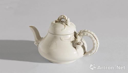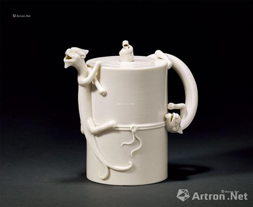 執(zhí)壺圓筒形,妙作手卷收攏形狀,中束結(jié)帶,兩蟠螭攀爬于壺腹兩側(cè),其一引首露吻,自然形成壺流,另一則弓背倒立而為把手,形象生動(dòng),匠心獨(dú)具。壺蓋截平,設(shè)一小螭為鈕。通體施牙白釉,釉色瑩潔溫潤(rùn),造型既樸實(shí)而又精巧,以一對(duì)追逐的螭龍為壺嘴與壺把,在寧?kù)o的釉色中,適時(shí)現(xiàn)出生機(jī),充分顯露出明末清初德化窯陶工精湛的設(shè)計(jì)和雕塑功力。