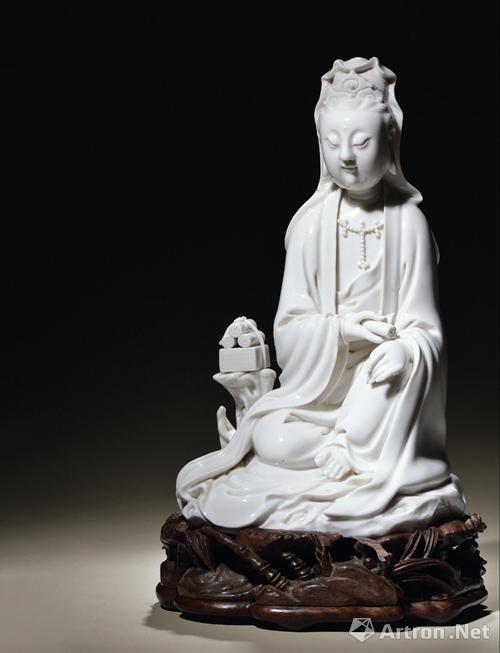此件觀音跣足坐于洞石之上,身側(cè)豎立石臺(tái),上置包袱經(jīng)卷。眉如彎月,雙目下視,鼻梁尖挺,唇角含笑,神態(tài)安詳。胸結(jié)如意形瓔珞,腕飾圓釧,手持經(jīng)卷,身著曳地襦裙,輕柔飄逸垂墜自然,體態(tài)嫻靜秀麗,手足刻畫細(xì)膩傳神;儀態(tài)柔美端莊,面如滿月,略帶微笑,神情慈祥恬靜。通體胎質(zhì)潔白緊致,釉色清亮潤(rùn)澤。洞石嶙峋,衣紋飄逸,雕刻自然生動(dòng),質(zhì)感強(qiáng)烈,顯示了極高的工藝水平。
