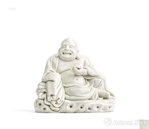 布袋和尚為五代后梁時(shí)期之僧人,明州奉化人。因常背負(fù)一只布袋,又稱布袋和尚,有其即為彌勒菩薩化身的說(shuō)法廣為流傳。此件布袋和尚像以白瓷燒塑,頭頂起丘,容貌飽滿,大耳垂肩,慈祥和藹。半披衣服袒胸露腹,右手依靠布袋,左手放置左膝,食指小指輕挑。兩腿蜷縮兩足相合坐于地上,衣褶相迭,垂然而下。雕像造型生動(dòng),動(dòng)態(tài)自然,栩栩如生。