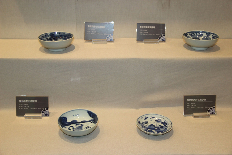 此次展出的一百件瓷品為“碗礁一號”出水瓷器中保存最完好、圖紋最精美的作品,其中以青花瓷居多,這些青花瓷均為康熙年間青花瓷鼎盛時期產(chǎn)品。工作人員告訴記者,不同于以往外銷瓷具有的異域風情,“碗礁一號”出水瓷器的中原文化更加鮮明。從沉船中打撈出來的瓷品主要以中國傳統(tǒng)山水人物圖案為主,如青花折枝牡丹盤、青花漁家樂淺腹碗、五彩博古紋盤等。