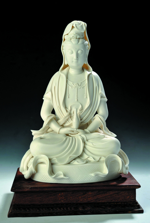 作品《魚籃觀音》便深具林吉祥自己的標簽。觀音赤足站立荷葉之上,下承水浪激涌,胸飾珠串,著通肩衣袍,右手提籃,左手持裙,垂目肅靜安詳。這件作品最引人注目的除了觀音面部的恬靜安詳、氣韻生動以外,還有其周身環(huán)繞的長飄帶。這些長飄帶不但燒制困難,更能充分發(fā)揮出線條對人物造型的重要作用,“以線刻體、以體托線、線體結(jié)合”,烘托出人物的精神氣質(zhì)和內(nèi)在性格,表現(xiàn)出一種細膩、纖巧的形式美。