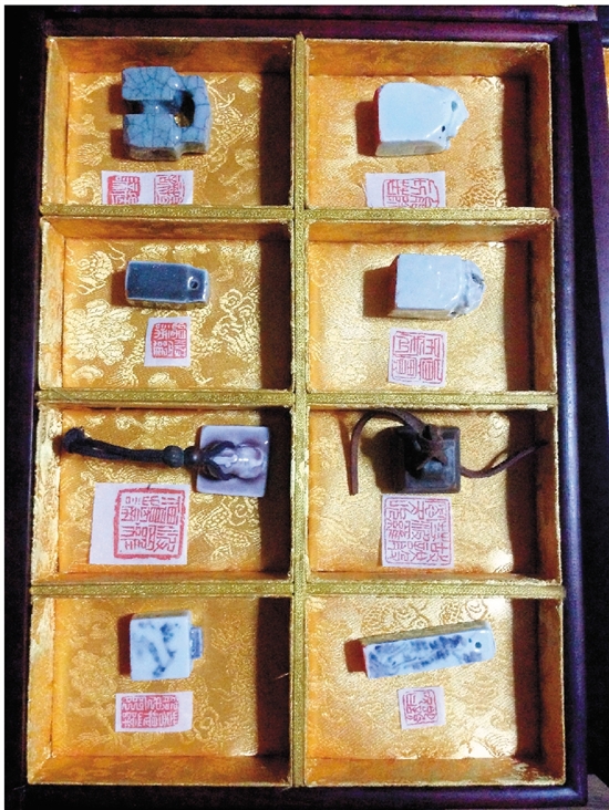 據(jù)查證,中國(guó)的印文化,若從時(shí)間上看則以陶印為最早,一直可追溯到7000年前的新石器時(shí)代,晚于陶印的瓷印,也流行于唐宋兩代。今人刻印一般多以市面上所購(gòu)石材為主,且不善于雕鈕,而履平兄的瓷印卻是集三藝于一身,即篆刻、雕鈕、制瓷,這就是他的絕活!因他早年學(xué)過雕塑造型,又深諳燒瓷密笈,故在器物造型方面,凡經(jīng)他之手的,無論龜、龍、獅、虎,或人物,或瓜果,或博古等等,絕非依樣畫葫者可以比擬,皆賦以情趣,各盡其妙,古樸典雅。如果僅從雕鈕全能上來說,當(dāng)今印壇無人能與之匹敵!而在施釉方面,他又極盡其能,以青瓷為主,間以青白釉、影青、烏金釉、豇豆紅以及青花、粉彩等,把他對(duì)各種釉色的理解發(fā)揮得淋漓盡致,使得傳統(tǒng)釉色更加絢麗多彩。至于篆刻那就無須再說了,這是他的老本行。但是,完成了這三件事,不等于完成了一個(gè)瓷印,它還需經(jīng)過1300度左右的高溫歷煉后才能知道成功與否。運(yùn)氣不好時(shí)十有八九被燒壞的事也是經(jīng)常發(fā)生的。這不,前幾天他打電話告訴我正在燒窯,下午熄火,傍晚出窯,讓我有空的話去看看。我于下午興沖沖地趕去了,到了藝術(shù)館已是傍晚時(shí)分。只見他沮喪著臉,坐在那抽煙發(fā)呆,見了我第一句話便是:“爛泥出問題了!”意思是瓷泥配料沒弄好,這一窯燒得不理想……