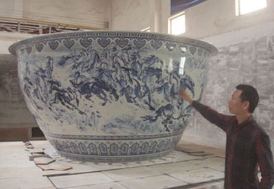 近期,潮安區(qū)古巷鎮(zhèn)的黃玉明燒制出碗口直徑2.68米、高1.35米,重量大約800斤的青花瓷碗,目前已準備相關(guān)資料,擬為該碗申報吉尼斯紀錄。據(jù)了解,青花瓷碗采用手繪釉下燒制工藝,以駿馬為元素。整個瓷碗要四五個成年人才能環(huán)抱住。圖為黃玉明在介紹巨型瓷碗的相關(guān)情況。吳冰 林雄銳 攝