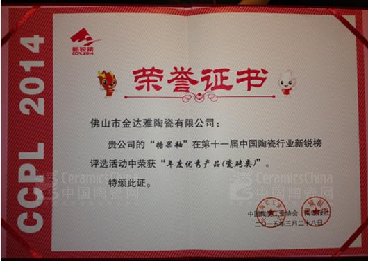 2015年3月28日,第十一屆中國陶瓷行業(yè)新銳榜頒獎典禮暨中國制造•佛山論壇在佛山新媒體產(chǎn)業(yè)園隆重舉行。金達(dá)雅陶瓷原創(chuàng)糖果釉瓷磚憑其全新技術(shù),閃亮肌理喜獲“年度優(yōu)秀產(chǎn)品(瓷磚類)”大獎,成為中國陶瓷行業(yè)2015年陶瓷新品中亮眼之星。